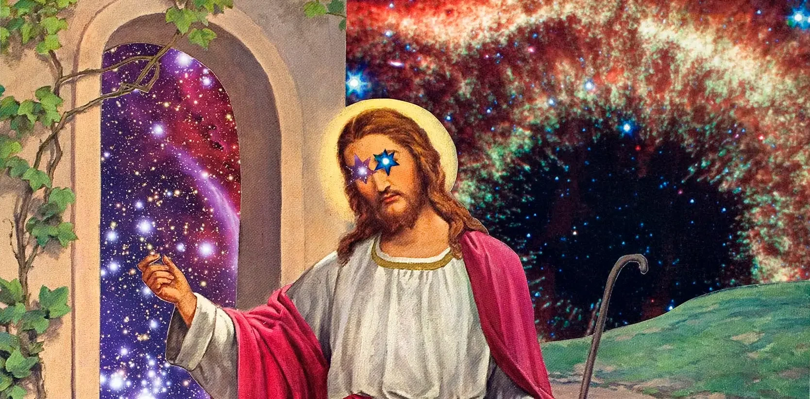 The first time I came across Aleksandra Mir's collages, I was deep in the research phase for an article trying to answer a question that had been nagging at me for a while: does the soul still have a place in our conversations about technology? I was trawling through visual examples that sat at the intersection of the spiritual and the digital, and then I landed on Mir's work. A religious icon looking up at a satellite, astronauts framed by halos, cherubs on a rocket launching ramp … I was instantly transfixed.