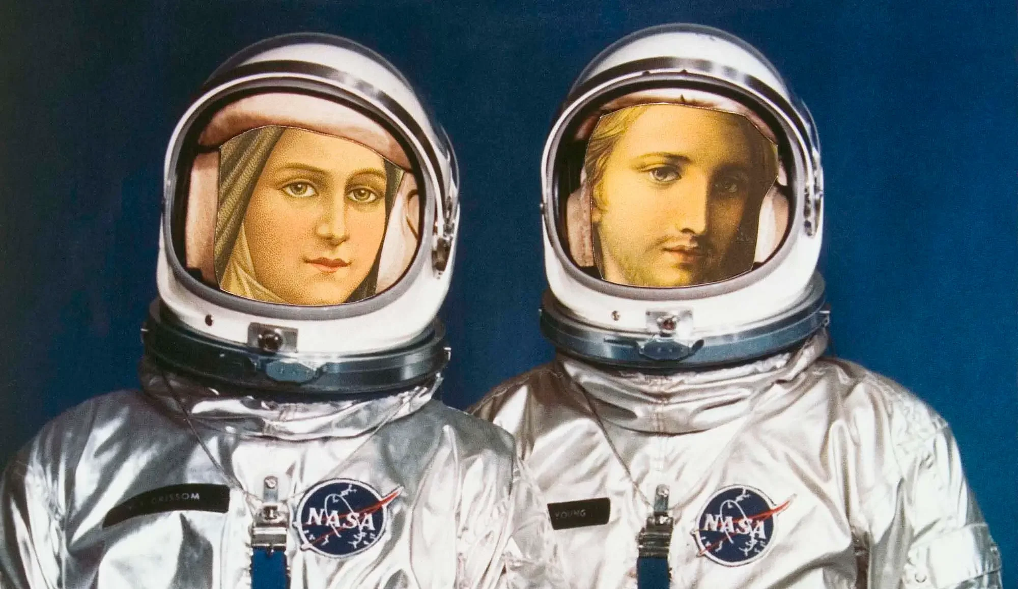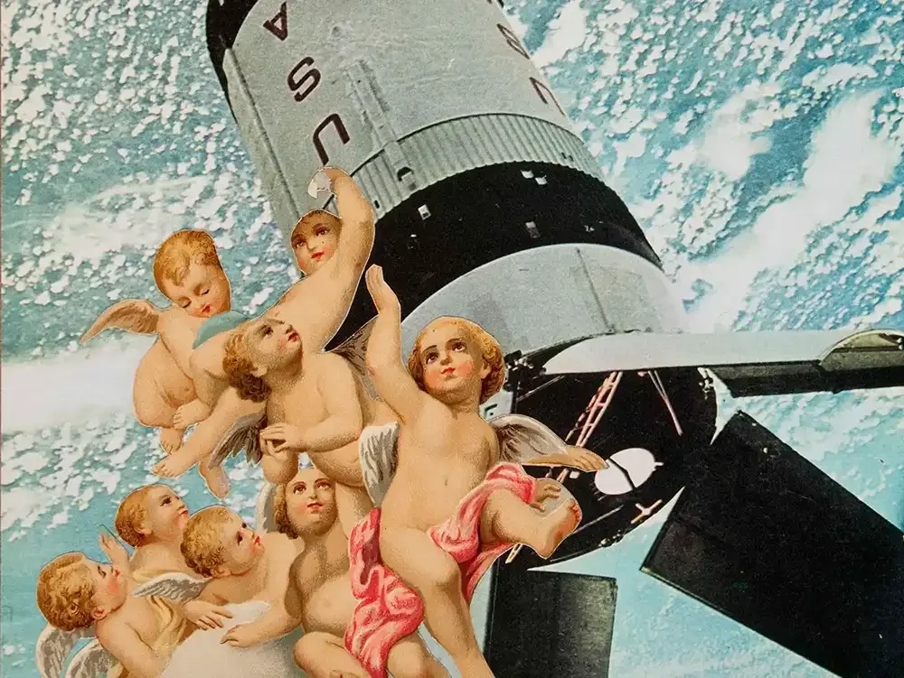 Typically, space travel and spirituality are positioned as opposing forces, when in fact there is considerable evidence that the two converge. To me, these collages make that convergence visible. We are taken into a world where the circular halo of a saint becomes the glass dome of an astronaut's helmet and angels gather around a space shuttle. These aren't superficial visual puns - they're pointing at something interesting about the spiritual dimensions of our technological ambitions.